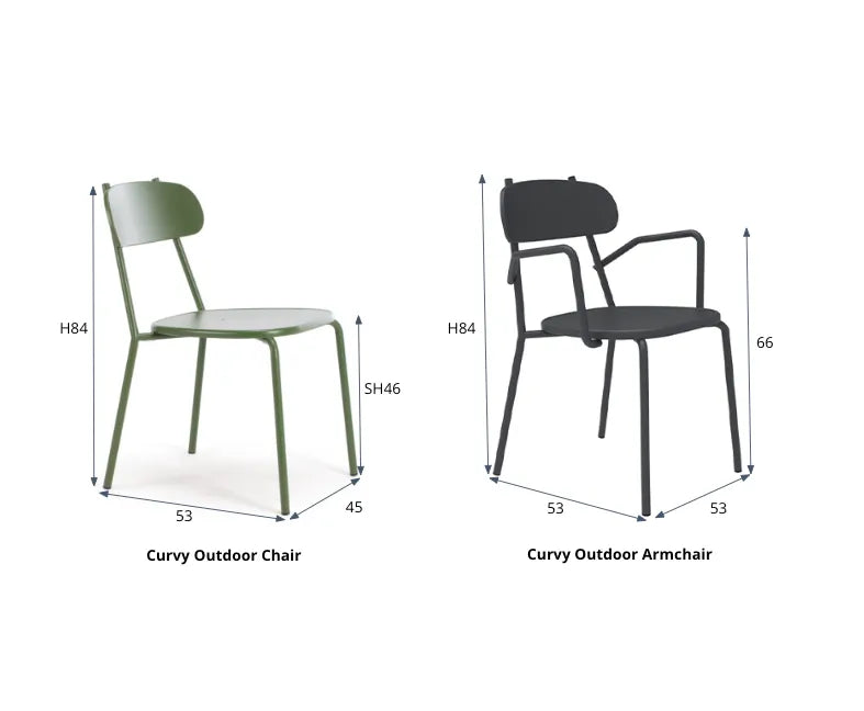 Curvy outdoor chairs come in two designs - a plain Curvy outdoor chair or the Curvy outdoor armchair with armrest. Choose whichever is most comfortable for you. See dimensions below.