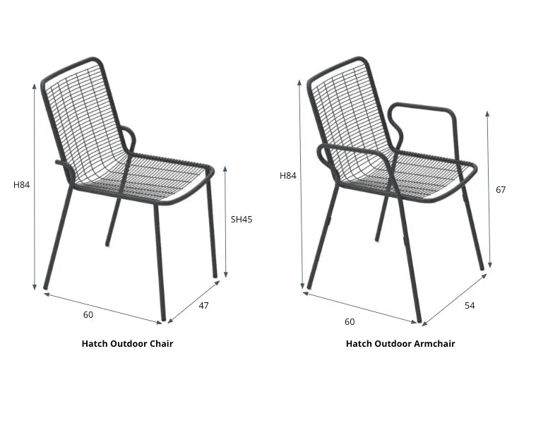 Hatch outdoor chairs come in two designs - a simple outdoor chair or outdoor armchair. Choose whichever is most comfortable for you. See dimensions below.