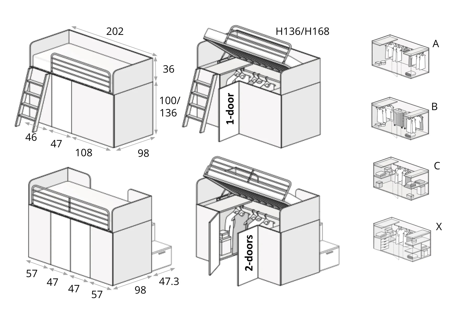 A unique space saving kids loft bed with a generous hidden wardrobe to maximise space. The loft bed is available in height 136cm and 168cm, with choice of ladder, side steps or back steps, and 4 internal configurations to choose from.