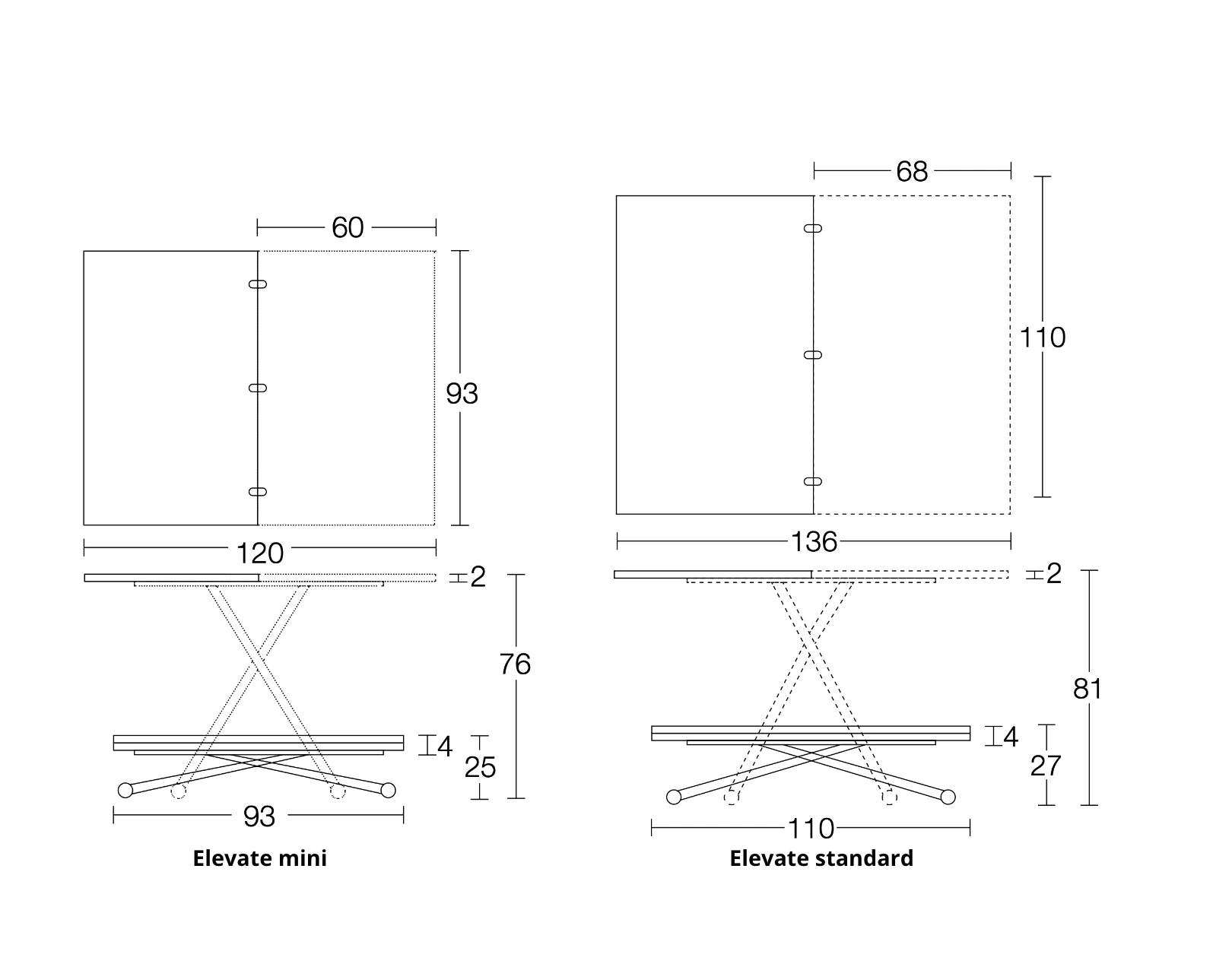 Cleverly engineered gas lifting mechanism easily transforms Elevate from a coffee table to a dining table - saving another table space in your home. There are 2 table sizes to choose for this model, the Elevate mini folds down to 25cm at the lowest and elevates to a maximum of 76cm; while the Elevate standard goes from 27cm to 81cm for dining height.