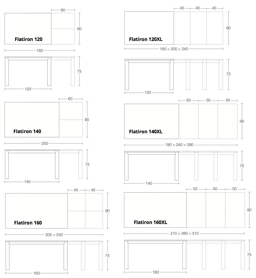 Flatiron expandable dining table takes its design inspiration from the iconic Flatiron building in New York. Thanks to the telescopic extending mechanism the table can be extended in one, two or three stages depending upon size of table. When choosing melamine, wood veneer or mortar style the extensions match the table top, for glass or ceramic the extensions would be in grey melamine finish.