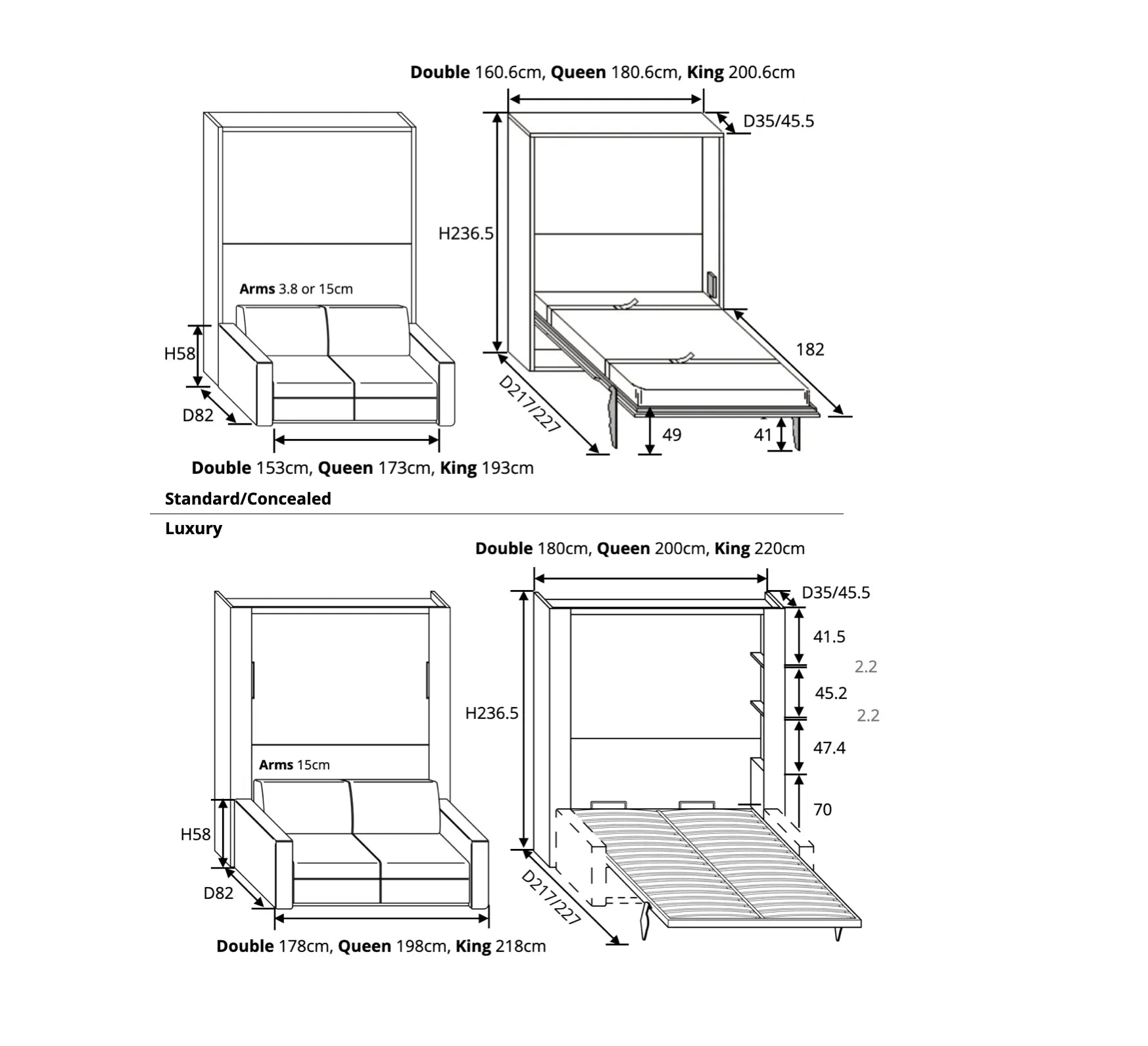 Slumbersofa Ease is available in double, queen & king size, vertical configuration only, and in 2 depths - 35cm or 45cm with internal shelves and pillow holder(s).