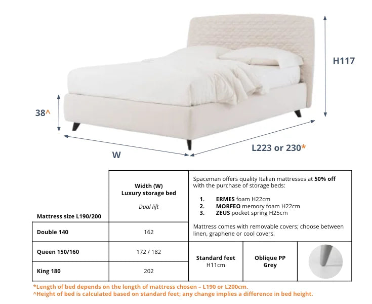 Upgrade to the dual lift system, and the mattress base can be lifted parallel to the bed base, as well as the 90 degree opening which makes it effortless to change mattress covers and easy access to the back of the storage area.