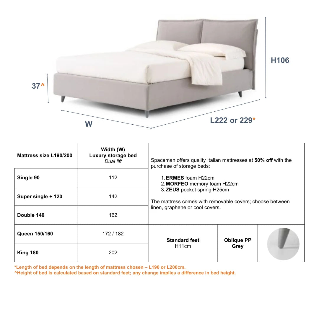 Upgrade to the dual lift system, and the mattress base can be lifted parallel to the bed base, as well as the 90 degree opening which makes it effortless to change mattress covers and easy access to the back of the storage area.