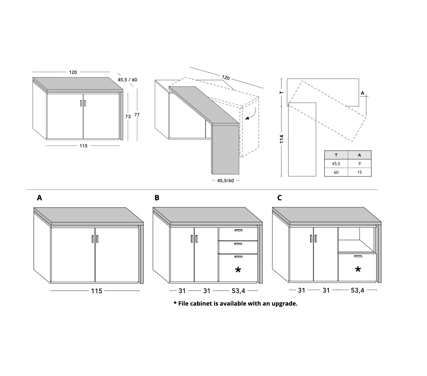 There are 3 cabinet configurations available to choose from (see dimensions below), and you have the option to add a file cabinet for the bottom last drawer in configurations B and C.