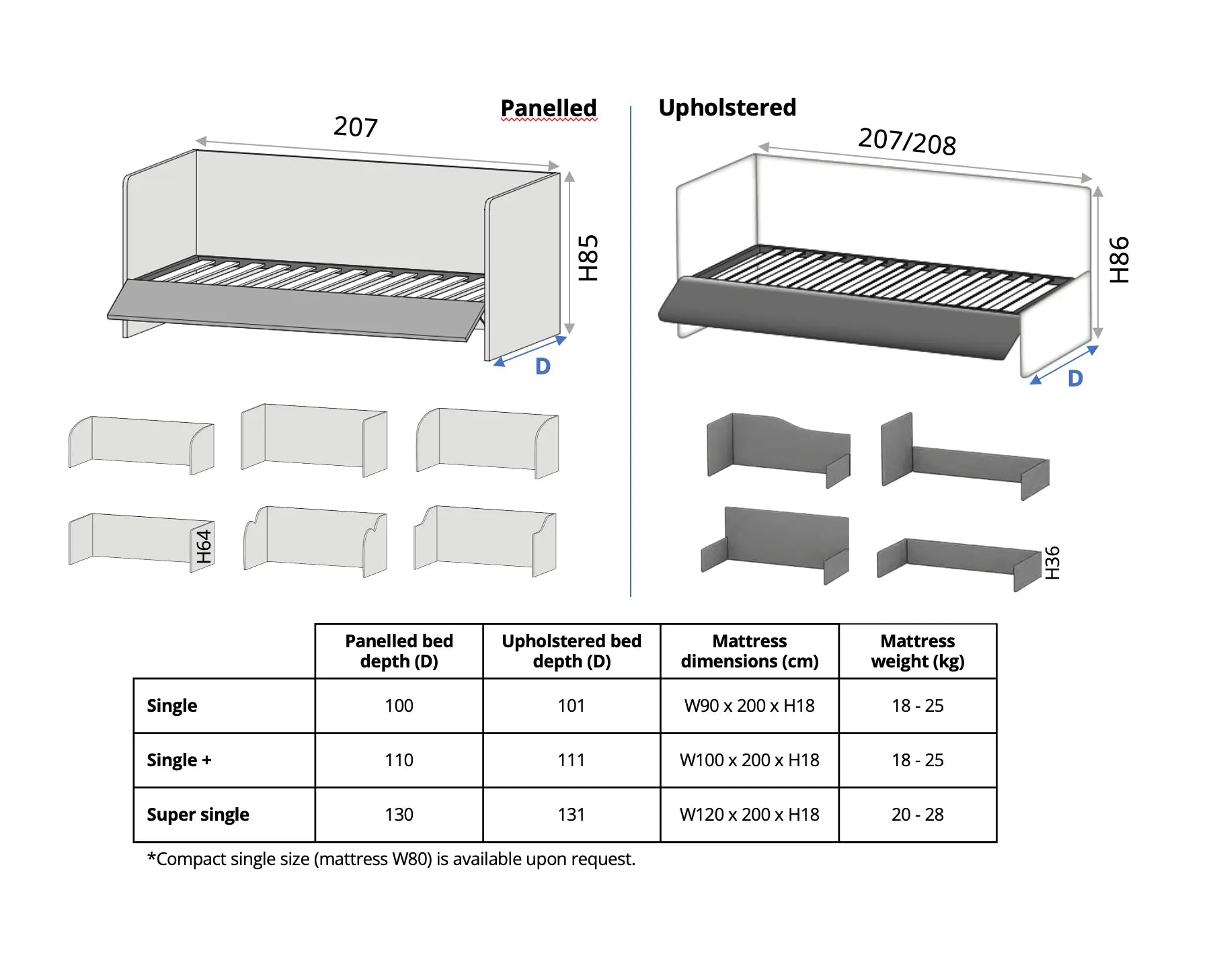 Panelled Emerge starts from $1,650, while upholstered Emerge starts from $2,250. Price varies with model, size, finishes and upgrades chosen; mattress and trundle options not included.