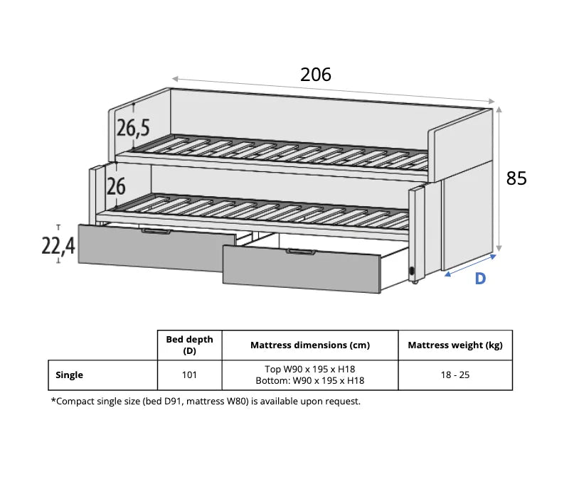 Gemini comes with a fixed upper bed, a pull-out lower bed, with drawers that are 22.4cm in height. For more customisation options, like adding desks, a trundle bed or customise handles, you can consider our other model - Cascade.
