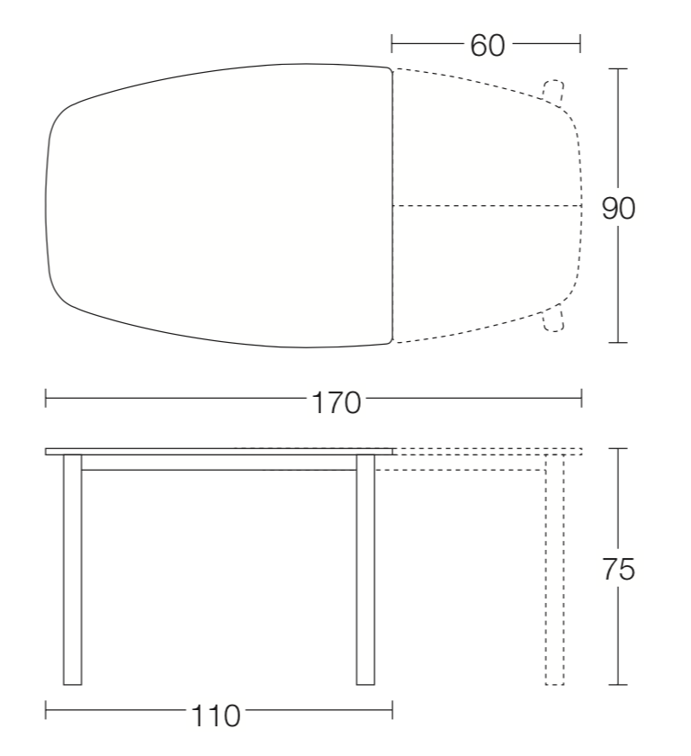 At first glance, Morph looks asymmetrical with squared edges on one end and curved on the other. This unique shape allows Morph to sit pretty propped against the wall. It then morphs into a squarish oval shape when fully extended to 170cm.