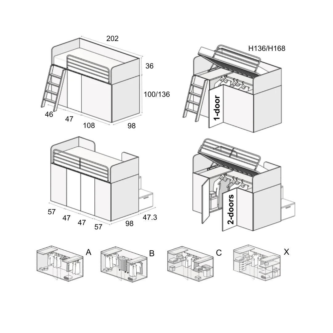 A unique space saving kids loft bed with a generous hidden wardrobe to maximise space. The loft bed is available in height 136cm and 168cm, with choice of ladder, side steps or back steps, and 4 internal configurations to choose from.