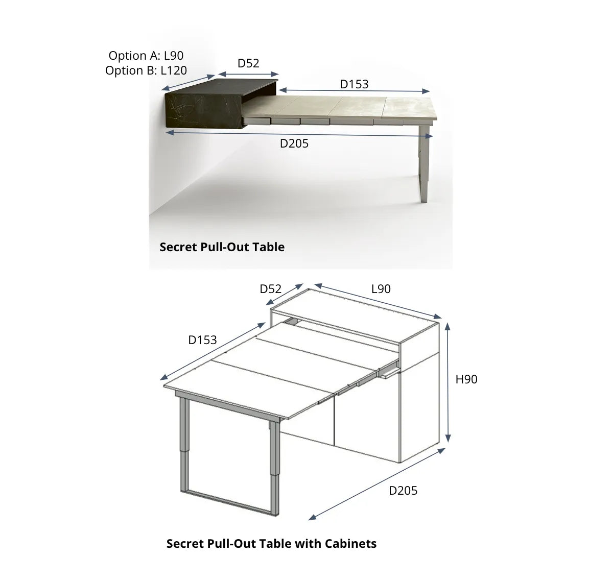 Secret Pull-Out Table ranges from $3,300 to $4,900, depending on the size and selected finishes in melamine, matte lacquer or glossy lacquer.