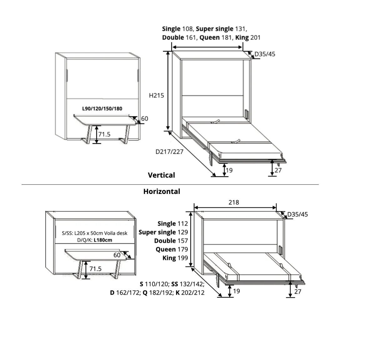Slumberdesk is available in 5 sizes from single to king size, horizontal and vertical configuration, and in 2 depths - 35cm or 45cm with internal shelves and pillow holder(s).