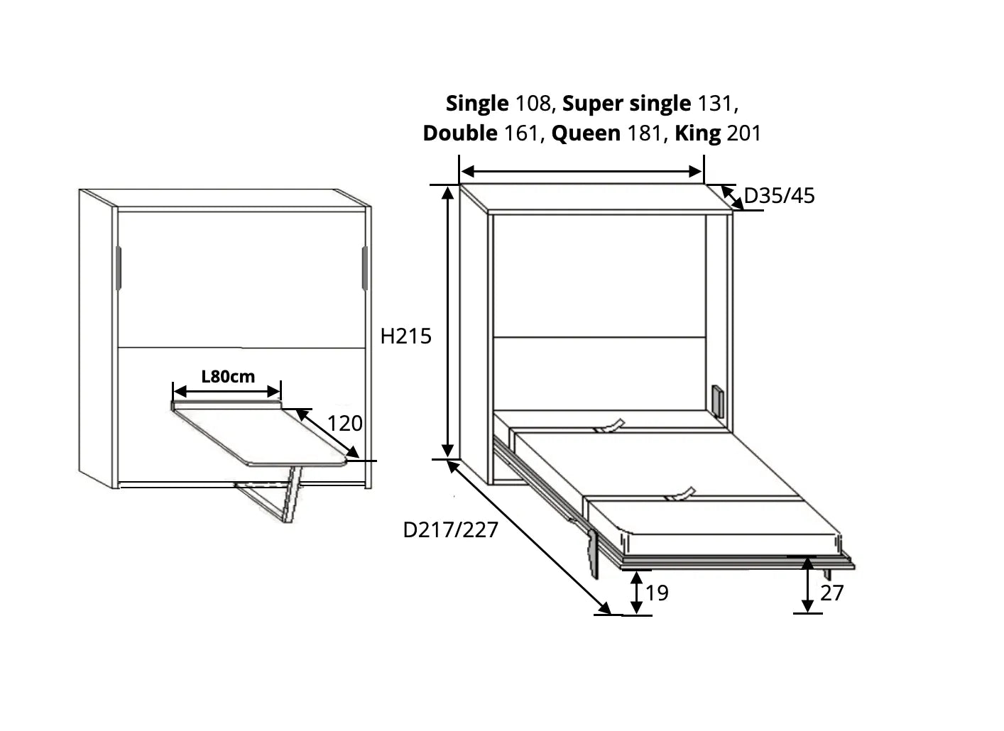 Slumberdine murphy bed and dining table is available in 5 sizes from single to king size, in vertical configuration, and in 2 depths - 35cm or 45cm with internal shelves and pillow holder(s).