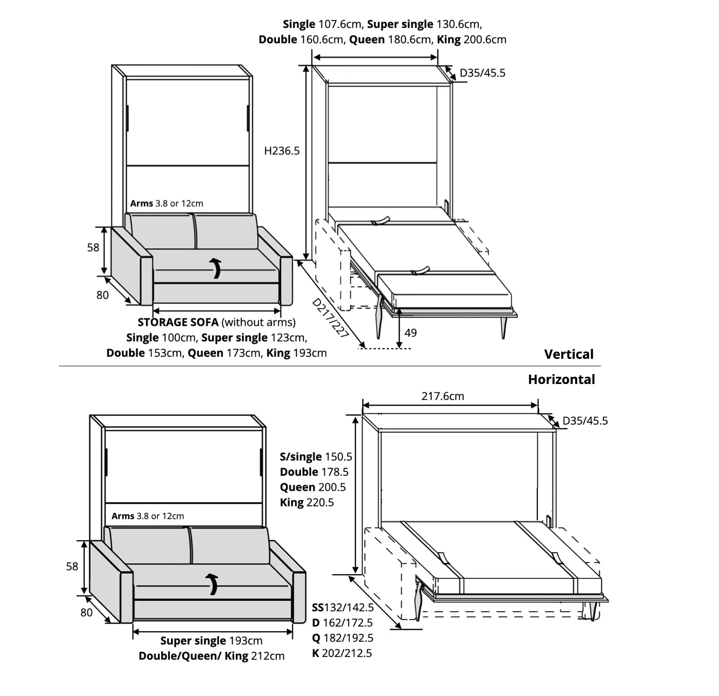 Slumbersofa Classic murphy bed is available in 5 sizes from single to king size, for the vertical configuration, and 4 sizes from super single to king size for horizontal configuration. Choose between 2 depths - 35cm or 45cm with internal shelves and pillow holder(s).